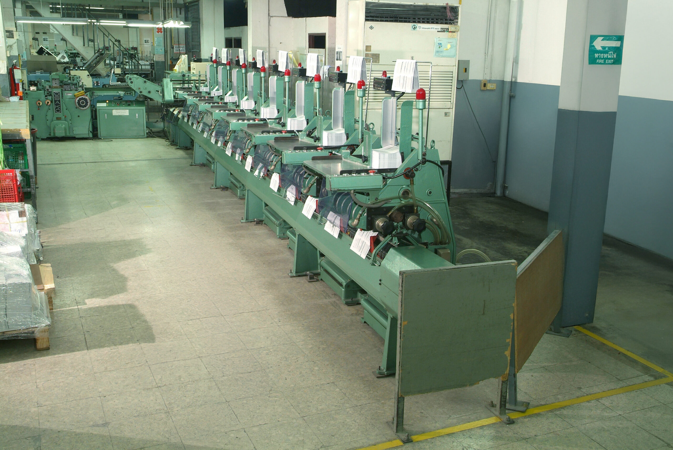 BrandEquipment NameQuantityOSAKOSADDLE-STITCHING SYSTEM QRT3682 UNITSOSAKOSADDLE-STITCHING SYSTEM RS-II+OS-62 UNITSTSKPERFECT BINDER TSK TM-181 UNITSTSKGATHERER 20 STATIONS1 UNITTSKGATHERER 14 STATIONS1 UNITYOSHINOTHREE-KNIFE TRIMMER2 UNITSITOTECPAPER CUTTER 115 MODEL4 UNITS