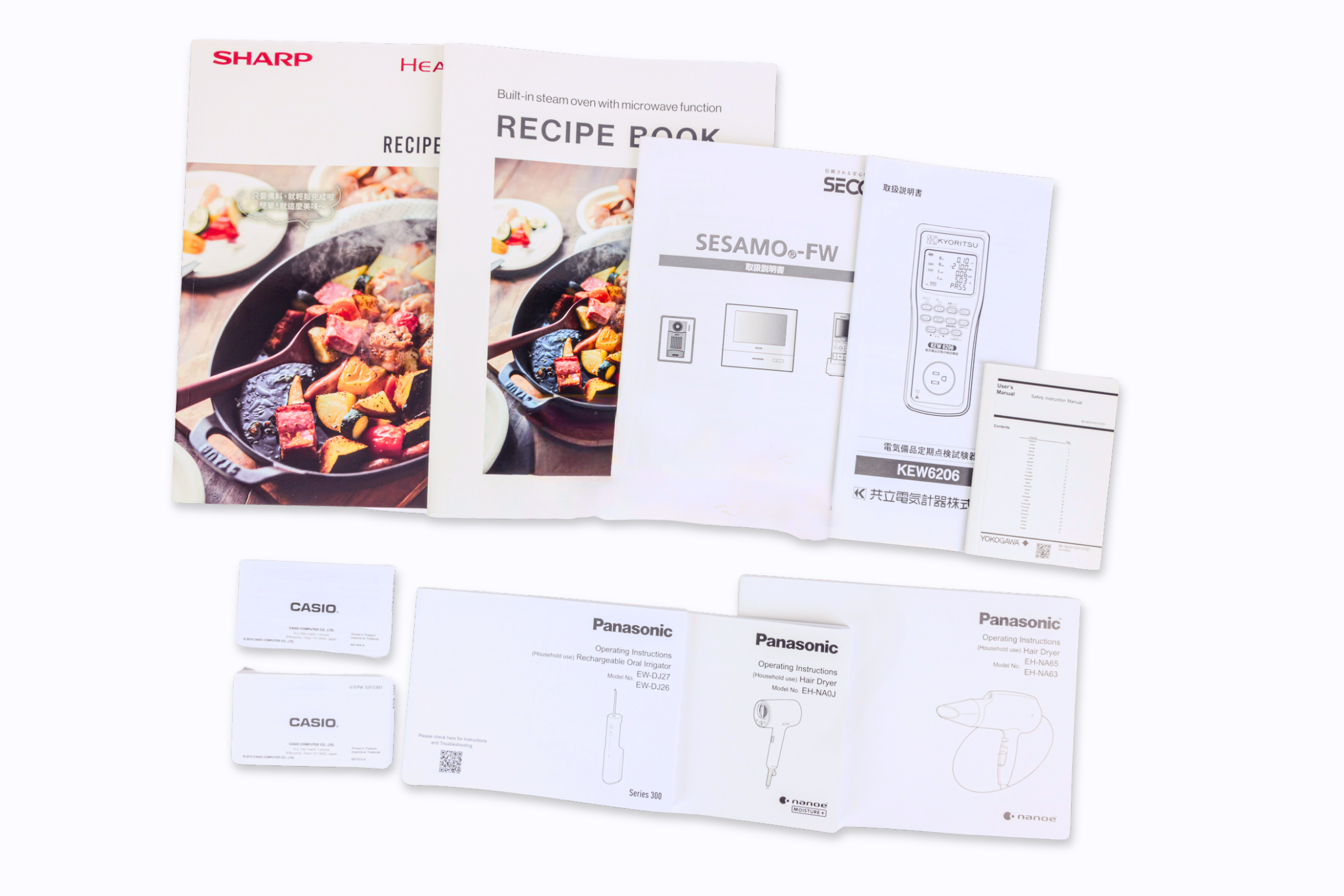 Abeno Printing Co., Ltd. is a trusted expert in the production of high-quality product manuals for electrical appliances, machinery, and products across various industries. We provide a one-stop service that includes translation, layout design, formatting, binding, and surface finishing—ensuring that each manual is export-ready and meets global standards.